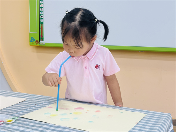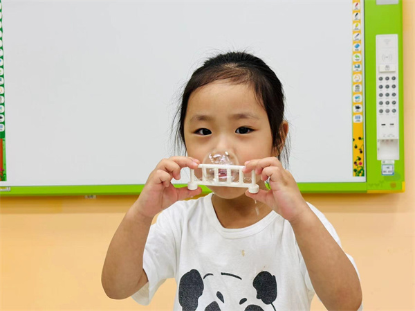 通過(guò)實(shí)際操作,孩子們知道了原來(lái)帶有封閉小孔的材料才能吹出泡泡。他們拿著屬于自己的專屬工具吹泡泡