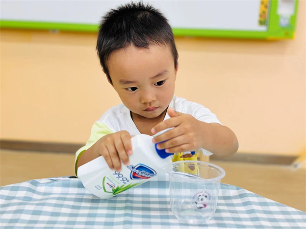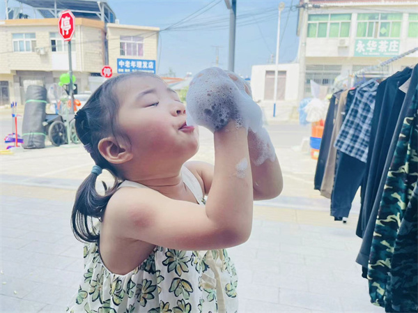 孩子們通過(guò)動(dòng)手操作實(shí)驗(yàn)發(fā)現(xiàn),在適量清水中加入我們生活中常見(jiàn)的洗手液、洗潔精、洗衣粉等都可以做出泡泡水,但是比例要合理,并且為了吹出的泡泡更加堅(jiān)韌不易破,我們還可以加入了白糖。