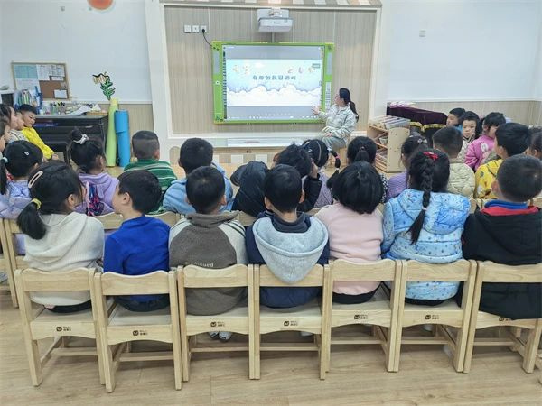 孩子們與老師共同討論,民間游戲有哪些?我想玩的游戲有什么?我想帶哪些器材?我知道怎么玩?孩子們積極參與討論中。