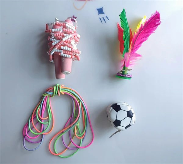 經(jīng)過我們前期的準(zhǔn)備,小朋友們投票選出并帶來了四樣器材:毽子、跳繩、皮筋、沙包。