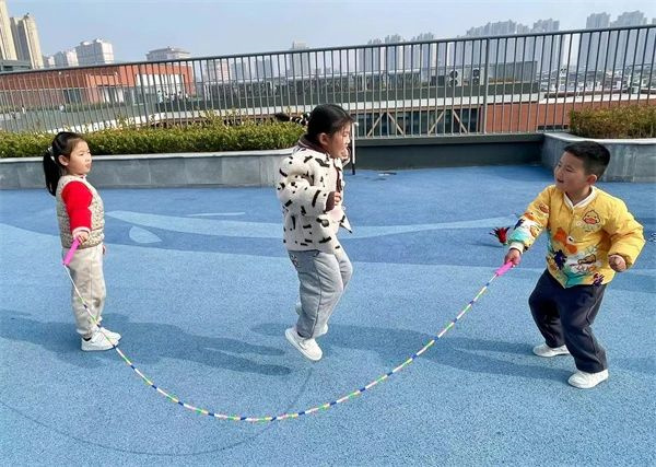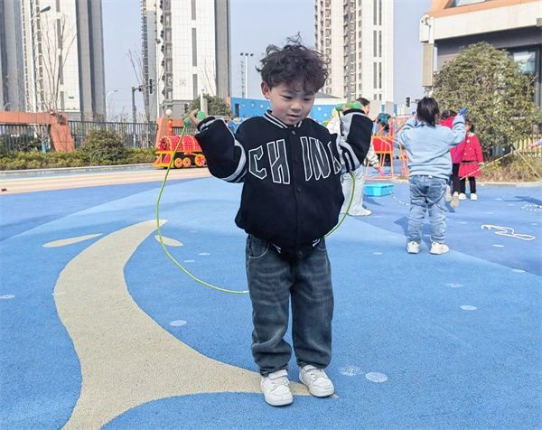 小朋友們看到這根小小跳繩都很感興趣,可是,它到底怎么玩呢?起初,小朋友們只會簡單的開合跳,后面開始學(xué)著兒歌邊唱童謠邊跳繩。你瞧!小朋友們一起配合的多好呀!
