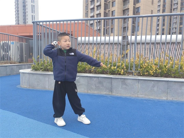“哼!大灰狼,看招!”小朋友們側(cè)身站立,將沙包舉過頭頂,然后用力扔出,投向大灰狼的家,解救小紅帽。在投擲過程中,小朋友們逐漸意識到,不僅需要手臂力量,還要有良好的空間感判斷能力。整個過程中,孩子們相互鼓勵,歡聲笑語回蕩在操場上。