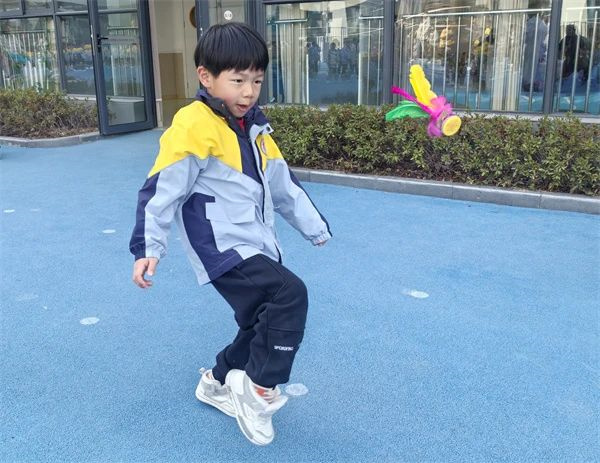 哇!這幾根羽毛粘在一起原來叫毽子?。】墒沁@小小羽毛做成的毽子怎么才能踢起來呢?通過孩子們的嘗試和不斷的練習(xí),知道毽子要放在右腳的內(nèi)側(cè),才能踢得又高又穩(wěn)。
