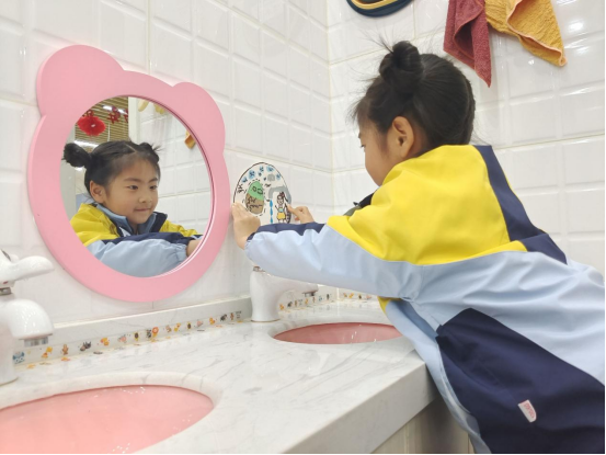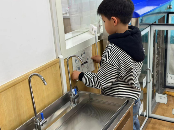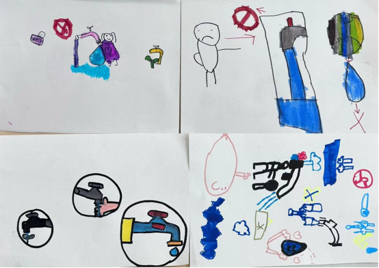 大班的小朋友們意識到想要保護水寶寶,在生活中不僅要增加水的循環(huán)利用,更是要從水的源頭處避免水的浪費。大家拿起畫筆設計出一張張屬于自己獨特的節(jié)水標志,并在水源處張貼。
