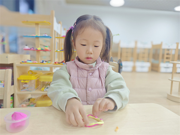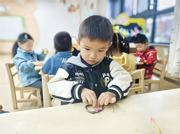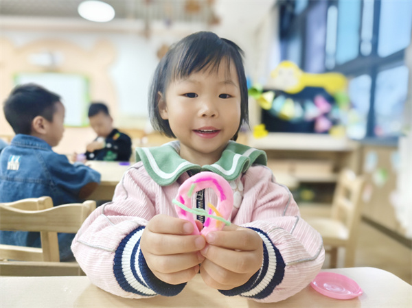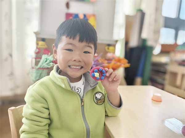 幼兒在探索“圓”的過程中充分發(fā)揮想象力,用自己喜愛的方式進行美術(shù)創(chuàng)作。甜甜圈可是小朋友們的最愛,粘土搓成長條繞成一個圓,用各種顏色的小紙片、小細繩進行裝飾,多種口味的“甜甜圈”出鍋嘍。