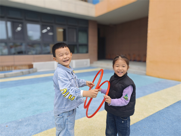 把呼啦圈和球放在一起也能玩哦!看,孩子們把球放在呼啦圈里,拉著球往前走,玩起了“趕小豬”游戲。