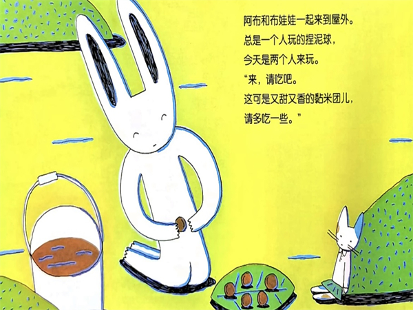 阿布和布娃娃一起來(lái)到屋外??偸且粋€(gè)人玩的捏泥球,今天是兩個(gè)人來(lái)玩。