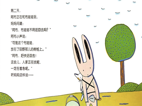 第二天,阿布正在和布娃娃玩,媽媽問(wèn)道:“阿布,布娃娃不用還回去嗎?”