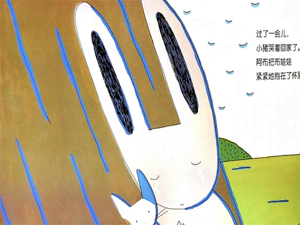 過(guò)了一會(huì)兒,小豬哭著回家了。阿布把布娃娃緊緊地抱在了懷里。