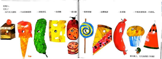 星期六,它吃了一塊巧克力蛋糕,一個冰淇淋甜筒,一條腌黃瓜,一塊奶酪,一截火腿,一根棒棒糖,一塊櫻桃派,一條香腸,一個紙杯蛋糕和一片西瓜。