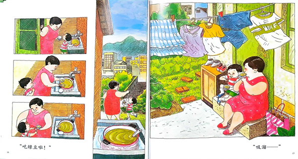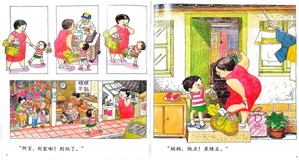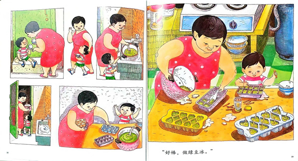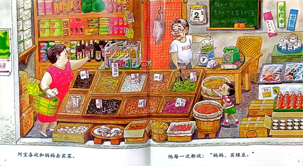 繪本《媽媽,買綠豆!》是一本洋溢著濃濃親情的溫馨小故事。講述了一個名叫阿寶的小男孩和媽媽一起買綠豆、洗綠豆、煮綠豆、喝綠豆湯、吃綠豆冰、種綠豆芽的故事。簡單、樸素的生活故事,交織著媽媽和孩子一起的幸福和滿足。