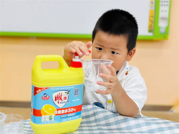 孩子們通過動(dòng)手操作實(shí)驗(yàn)發(fā)現(xiàn),在適量清水中加入我們生活中常見的洗手液、洗潔精、洗衣粉等都可以做出泡泡水,但是比例要合理,并且為了吹出的泡泡更加堅(jiān)韌不易破,我們還可以加入了白糖。