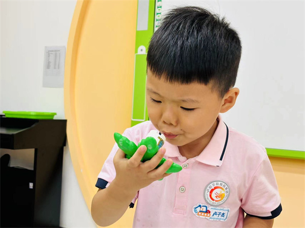 通過實(shí)際操作,孩子們知道了原來帶有封閉小孔的材料才能吹出泡泡。他們拿著屬于自己的專屬工具吹泡泡。