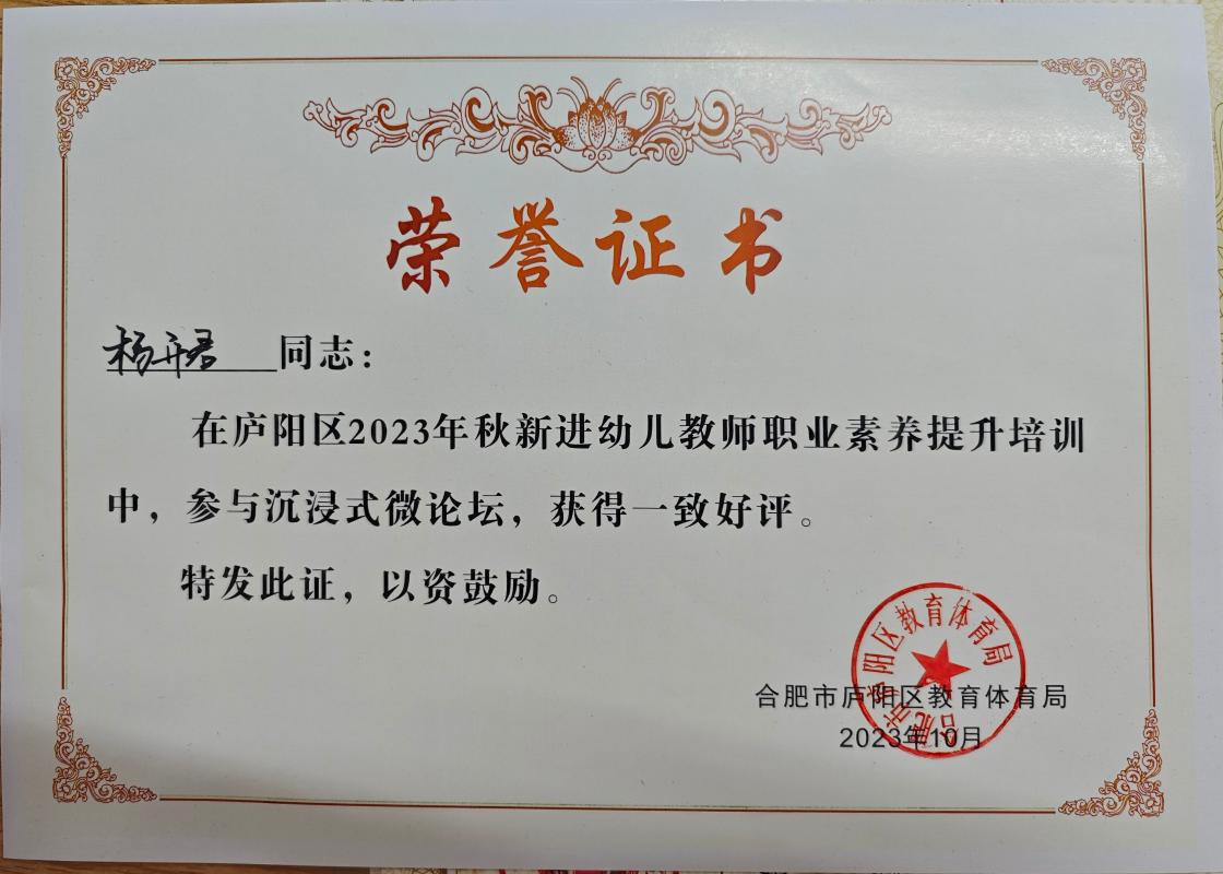 廬陽學(xué)前教育集團(tuán)和月融匯園:執(zhí)行園長楊開君廬陽區(qū)2023秋進(jìn)幼兒教師職業(yè)素養(yǎng)提升獲得一致好評(píng)