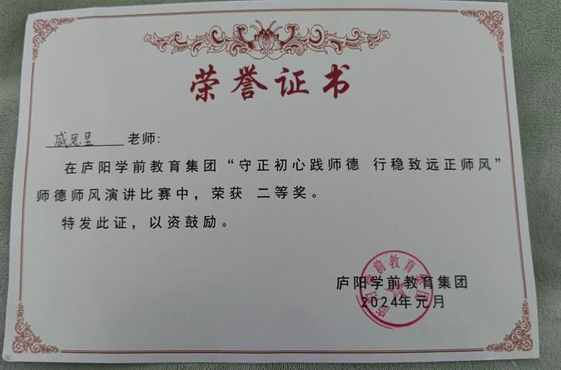 廬陽學前教育集團和月融匯園:戚思昱老師在廬陽學前教育集團師德師風演講比賽中榮獲二等獎
