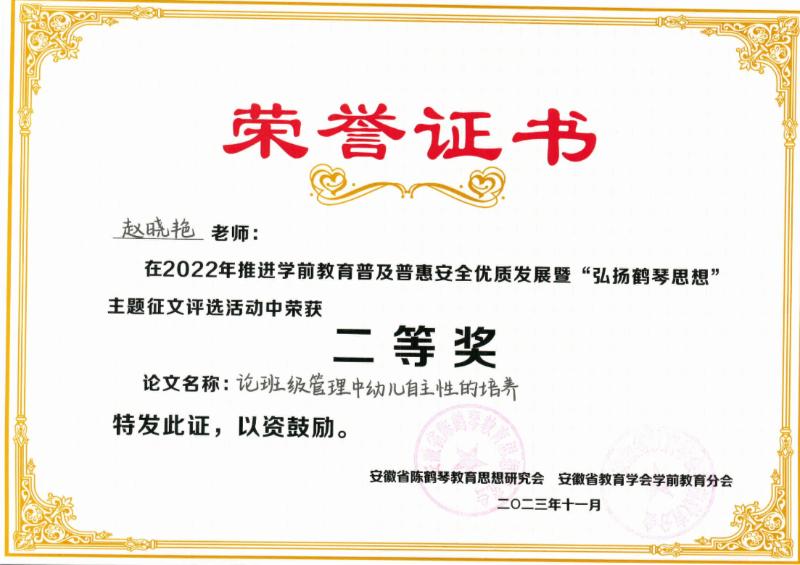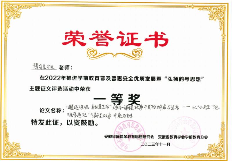 廬陽(yáng)學(xué)前教育集團(tuán)和月融匯園:傅維維、趙曉艷在2022年推進(jìn)學(xué)前教育普及普惠安全優(yōu)質(zhì)發(fā)展暨“弘揚(yáng)鶴琴思想” 主題征文評(píng)選活動(dòng)中分別榮獲一等獎(jiǎng)、二等獎(jiǎng)
