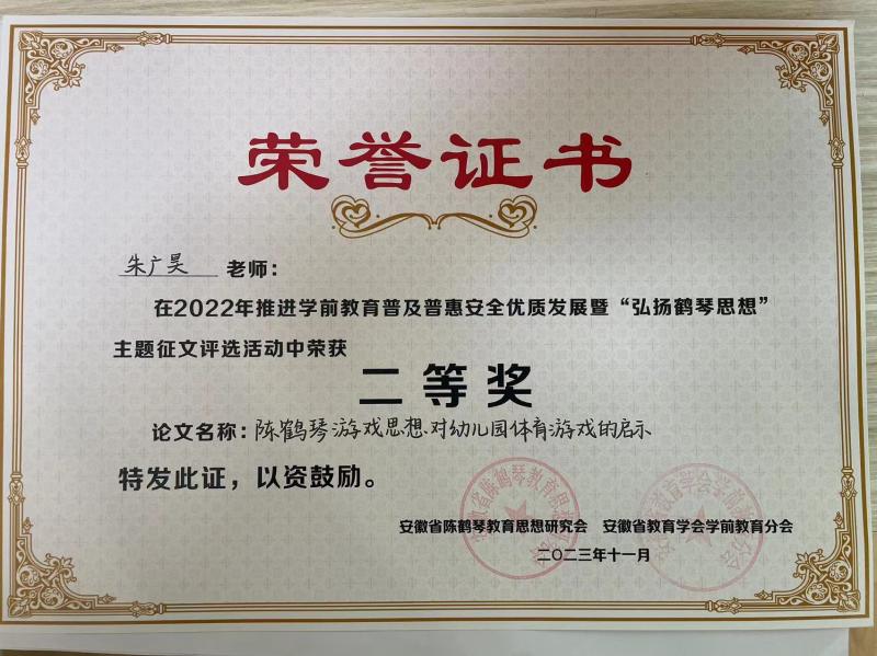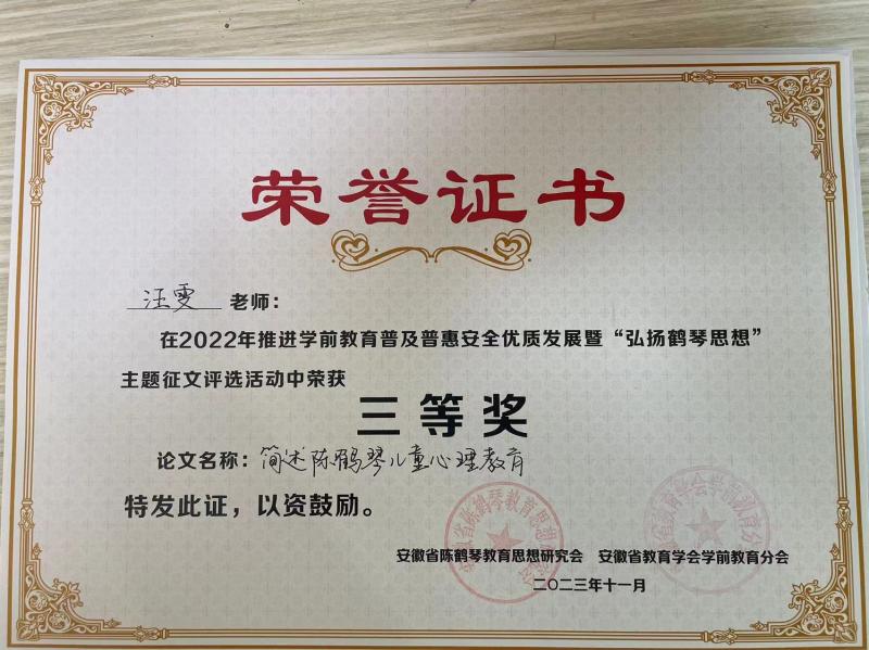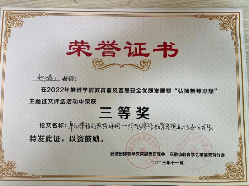 廬陽學(xué)前教育集團(tuán)麓湖融光園:朱廣昊、趙婉、汪雯在2022年推進(jìn)學(xué)前教育普及普惠安全優(yōu)質(zhì)發(fā)展暨“弘揚(yáng)鶴琴思想” 主題征文評選活動(dòng)中分別榮獲二等獎(jiǎng)、三等獎(jiǎng)、三等獎(jiǎng)