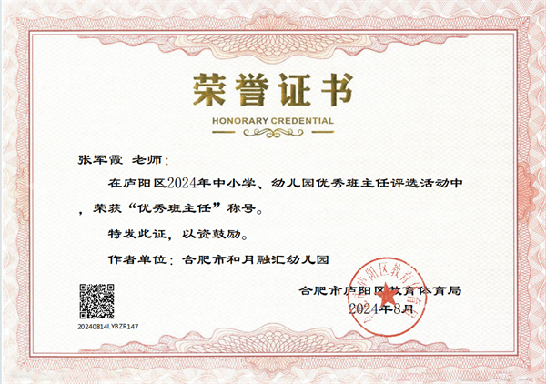廬陽學(xué)前教育集團(tuán)和月融匯園:張軍霞老師在廬陽區(qū)2024年中小學(xué)、幼兒園優(yōu)秀班主任評(píng)選活動(dòng)中榮獲“優(yōu)秀班主任”稱號(hào)