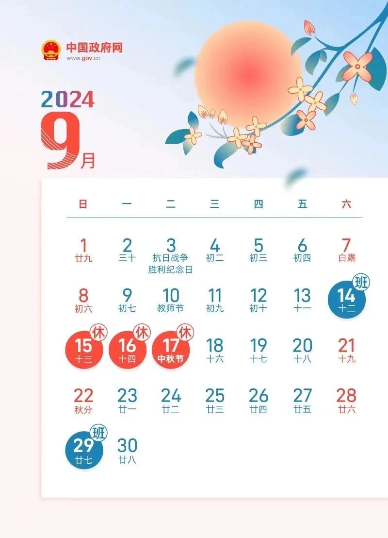 尊敬的家長:您好!花好月圓之時,佳節(jié)如約而至。廬陽教育發(fā)展集團全體教職工向您和您的家人致以最誠摯的問候。根據(jù)《國務院辦公廳關于2024年部分節(jié)假日安排通知》,現(xiàn)將2024年中秋節(jié)放假安排通知如下:
