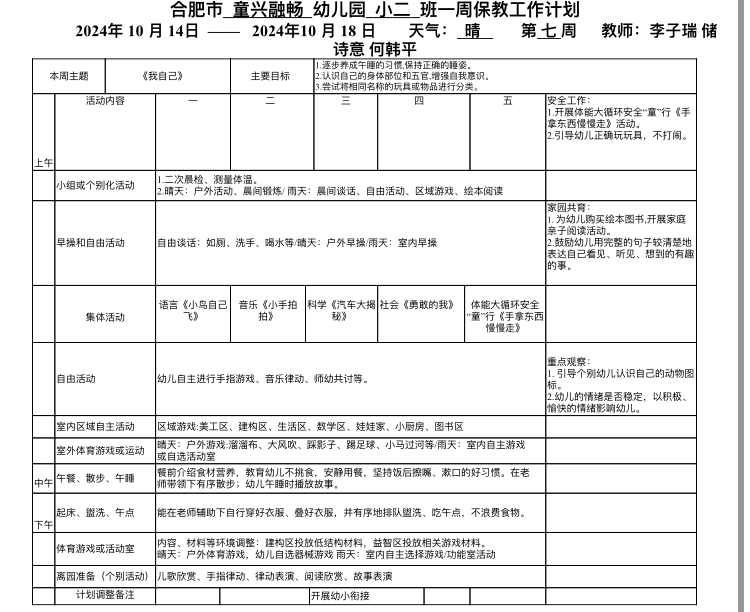 廬陽(yáng)教育發(fā)展集團(tuán)童興融暢園:小班第七周保教工作計(jì)劃