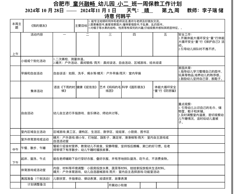 廬陽(yáng)教育發(fā)展集團(tuán)童興融暢園:小班第九周保教工作計(jì)劃