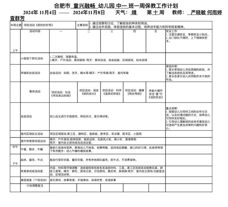廬陽教育發(fā)展集團(tuán)童興融暢園:中班第十周保教工作計劃
